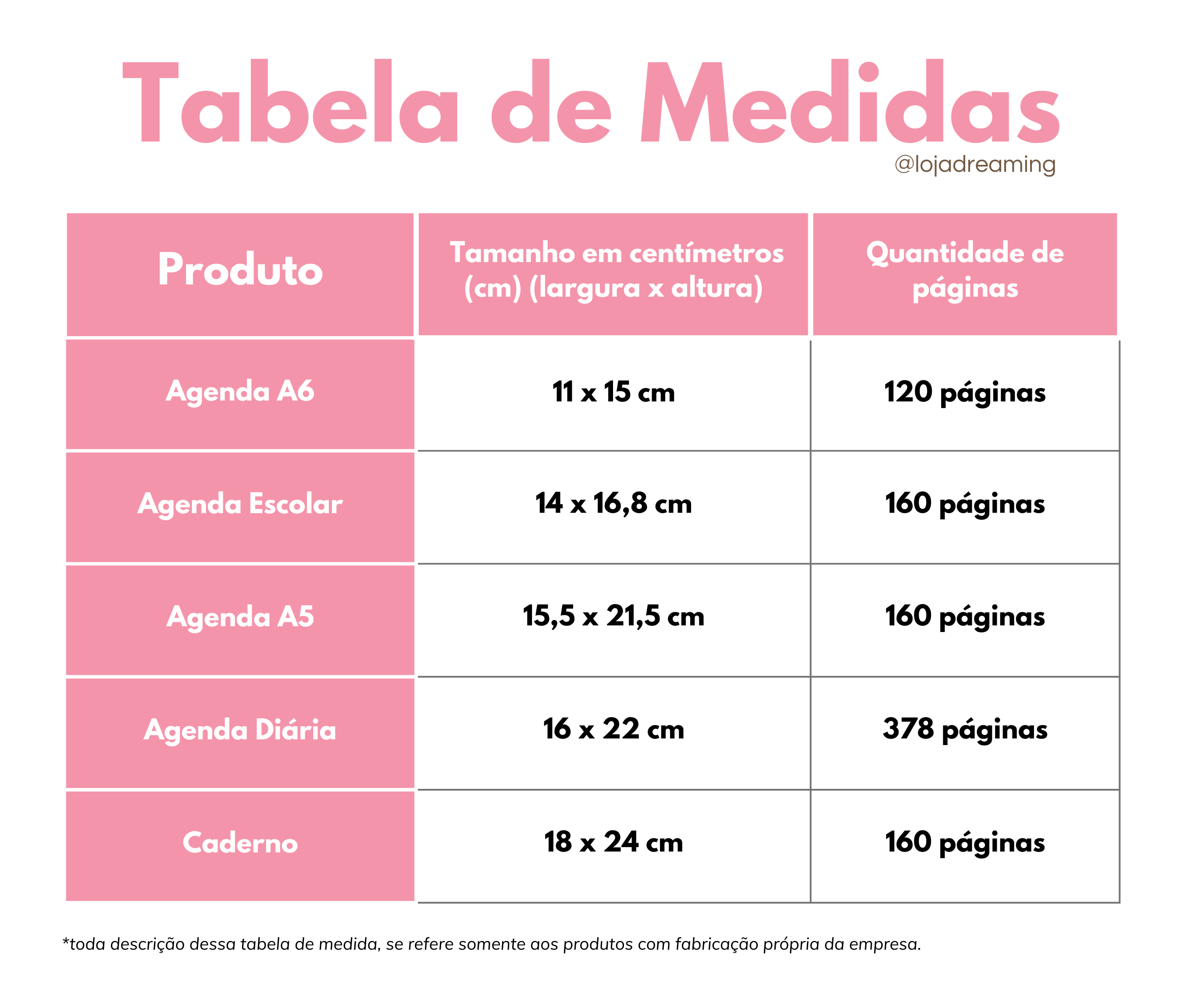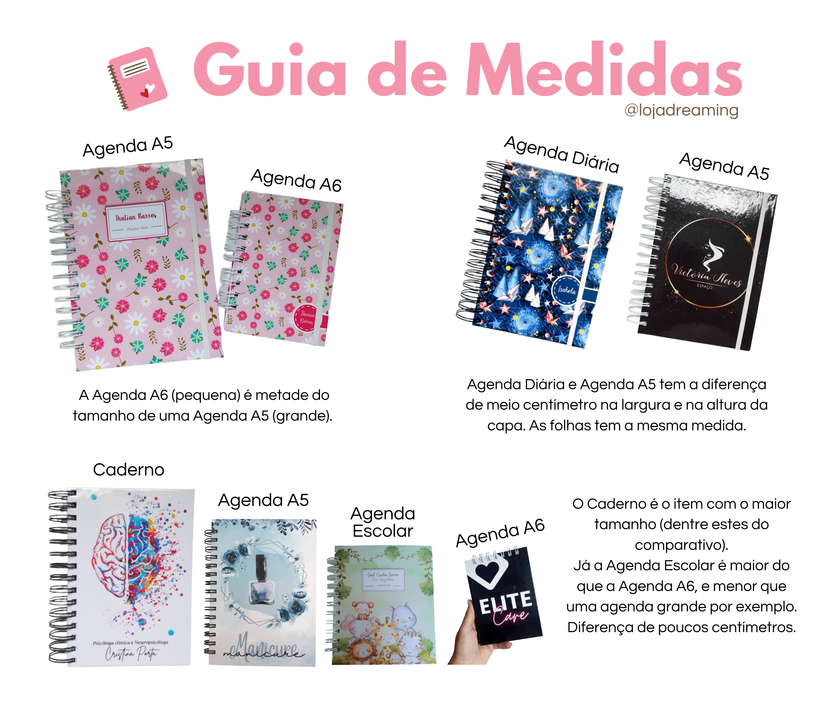 Agora acabaram suas dúvidas! Criamos uma tabela pra você ter um comparativo dos tamanhos das agendas e cadernos que a gente produz. E montamos também um guia, explicando melhor sobre algumas dúvidas que surgem referente aos nossos produtos.