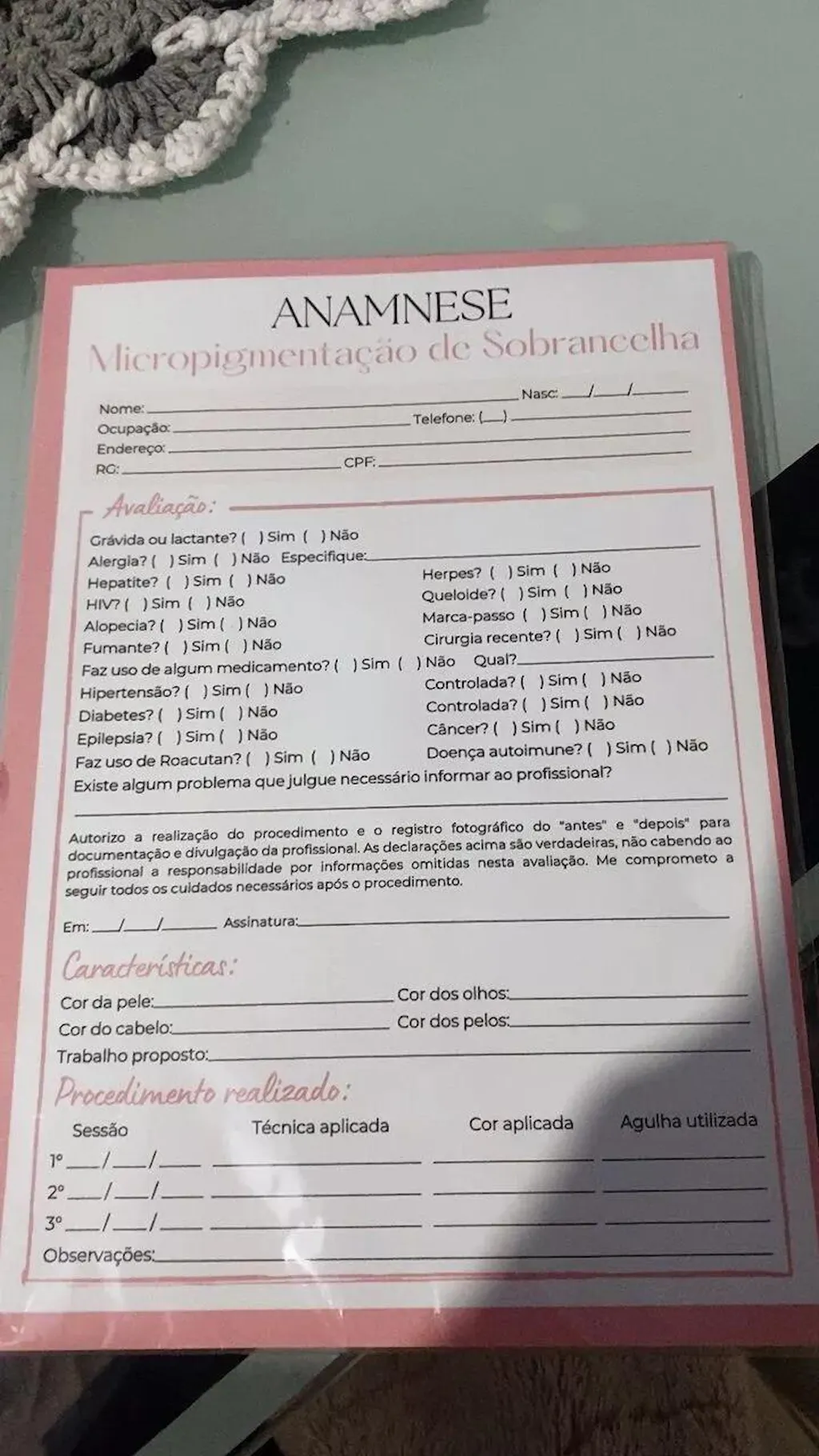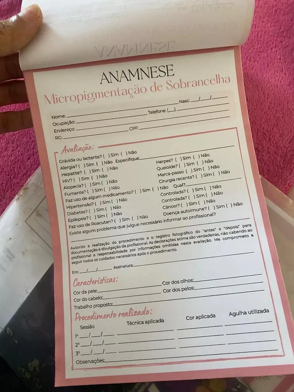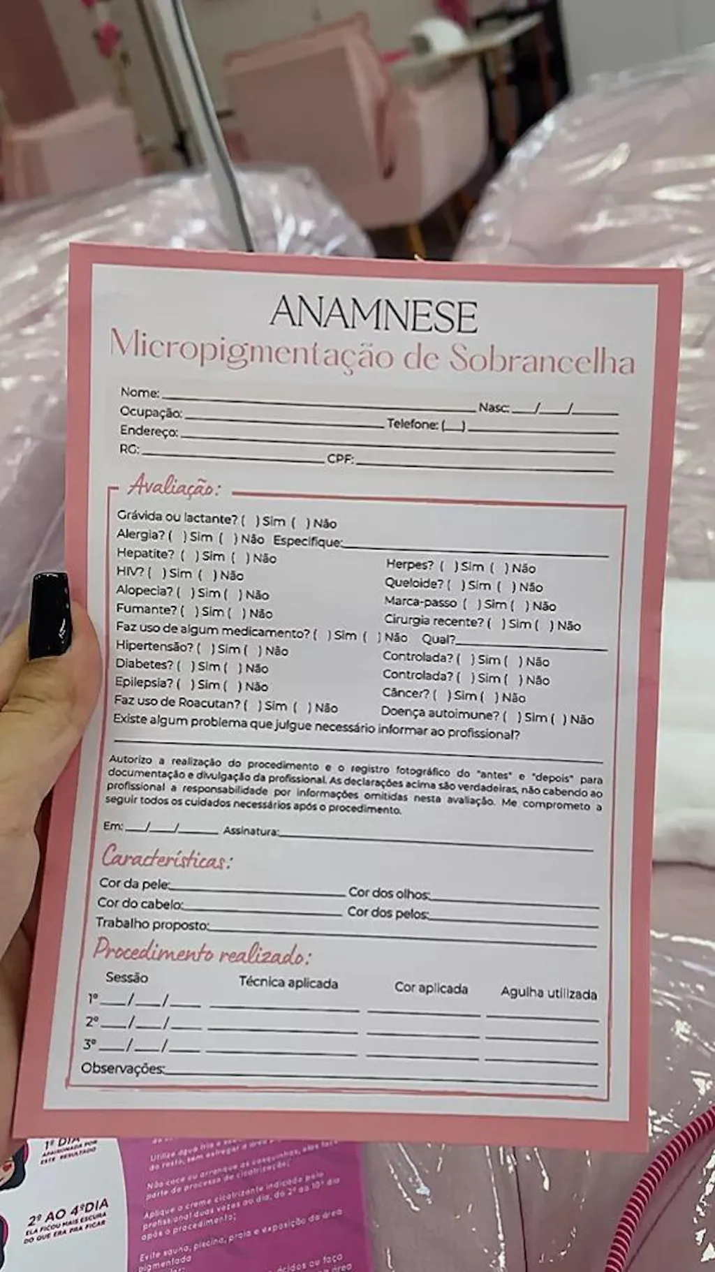 A Ficha Anamnese de Micropigmentação de Sobrancelha é um item indispensável para profissionais que trabalham com micropigmentação. Ela permite que você tenha um registro completo dos dados do cliente, histórico médico e suas expectativas em relação ao procedimento. Além disso, a ficha anamnese agrega um toque de profissionalismo e exclusividade ao seu atendimento. O preço é acessível e o produto é enviado para todo o Brasil.